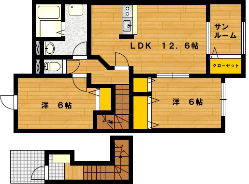 部屋の広さ 洋6帖×2・LDK12.6帖 対象階数 2階建 2階