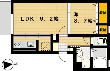 横の洋室3.7帖には収納が大小2ヶ所あり、コンパクトサイズの単身者向けの1LDKになりますので収納スペースとしては十分かと思います。
