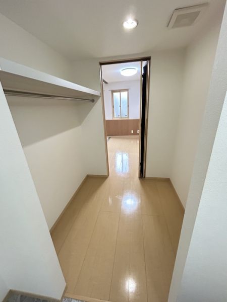 来客時には寝室が隠せるようになってます。その他の時は建具を開けてお部屋を広く使ってもいいですね。ウォークインクローゼットは洋室からも洗面室からも利用できる間取り。