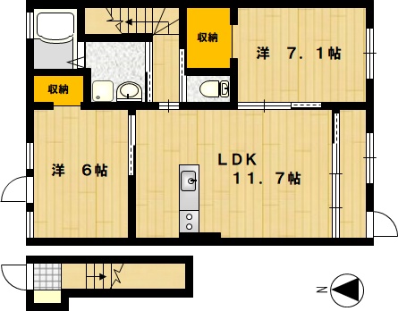 部屋の広さ | 洋6帖・洋7.1帖・LDK11.7帖 | 対象階数 | 2階建 2階 | |