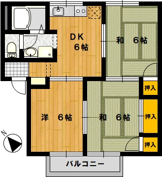 部屋の広さ 洋6帖・和6帖×2・DK6帖 対象階数 2階建 1階