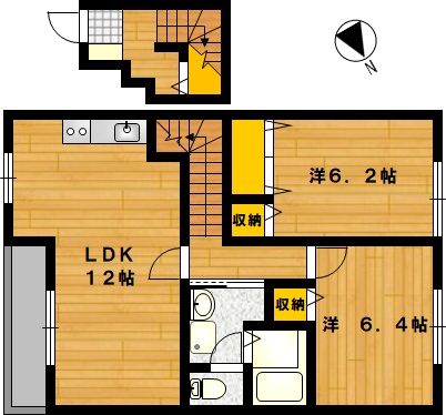 部屋の広さ | 洋6.4帖・洋6.2帖・LDK12帖 | 対象階数 | 2階建 2階 | |