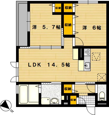 部屋の広さ | 洋6帖・洋5.7帖・LDK14.5帖 | 対象階数 | 3階建 1階 | |