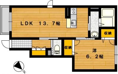 部屋の広さ | LDK13.7帖・洋6.2帖 | 対象階数 | 2階建 1階 | |
