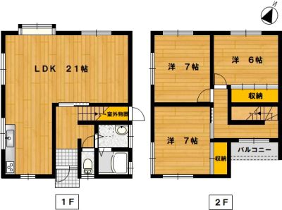 部屋の広さ 1F:LDK21帖 2F:洋7帖×2・洋6帖 対象階数 2階建