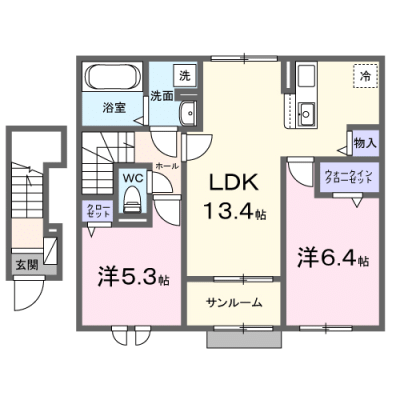 部屋の広さ LDK13.4帖・洋6.4帖・洋5.3帖 対象階数 2階建 2階