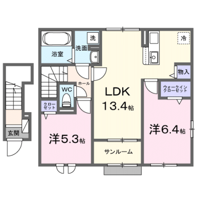 部屋の広さ | LDK13.4帖・洋6.4帖・洋5.3帖 | 対象階数 | 2階建 2階 | |