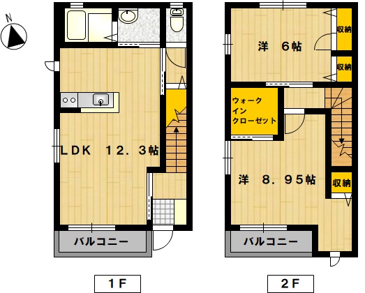 部屋の広さ | 1F:LDK12.3帖 2F:洋8.95帖・洋6帖 | 対象階数 | 2階建 1.2階 | |