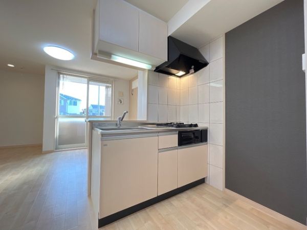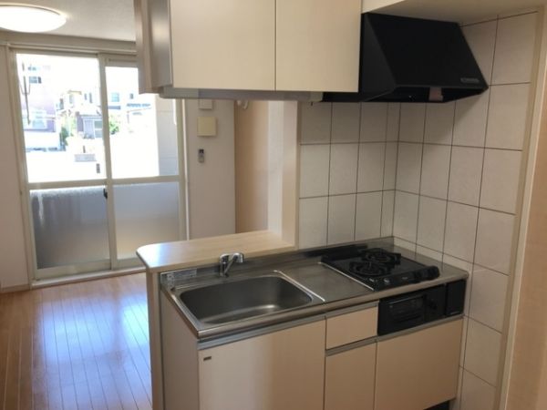 2口ガスコンロの付いた対面式キッチンのある1Rです。