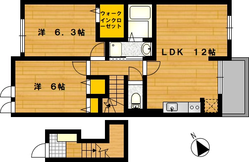 部屋の広さ | 洋6.3帖・洋6帖・LDK12帖 | 対象階数 | 2階建 2階 | |