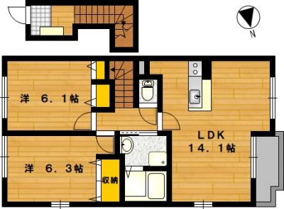 部屋の広さ | 洋6.3帖・洋6.1帖・LDK14.1帖 | 対象階数 | 2階建 2階 | |