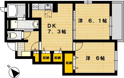 部屋の広さ | 洋6.1帖・洋6帖・DK7.3帖 | 対象階数 | 2階建 1階 | |
