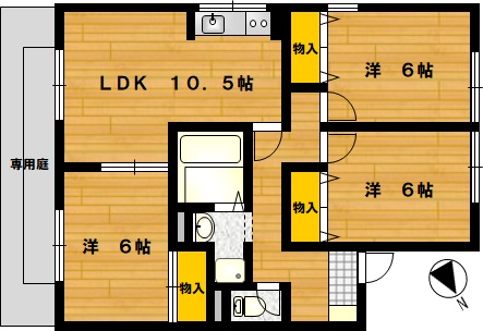 部屋の広さ | 洋6帖×3・LDK10.5帖 | 対象階数 | 2階建 1階 | |