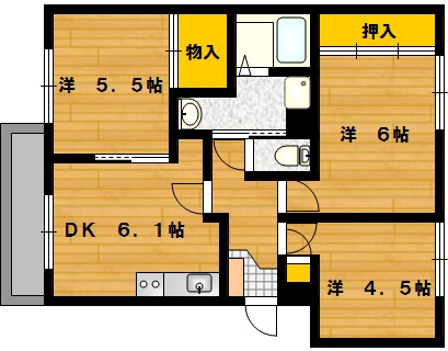 部屋の広さ 洋6帖・洋5.5帖・洋4.5帖・DK6.1帖 対象階数 3階建 2階