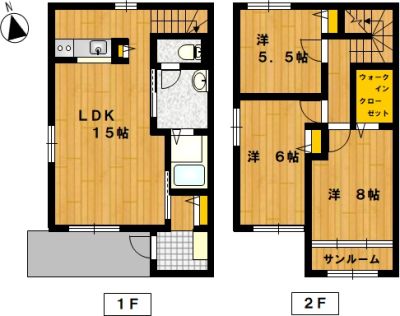 部屋の広さ 1F:LDK15帖 2F:洋8帖・洋6帖・洋5.5帖 対象階数 2階建 1.2階