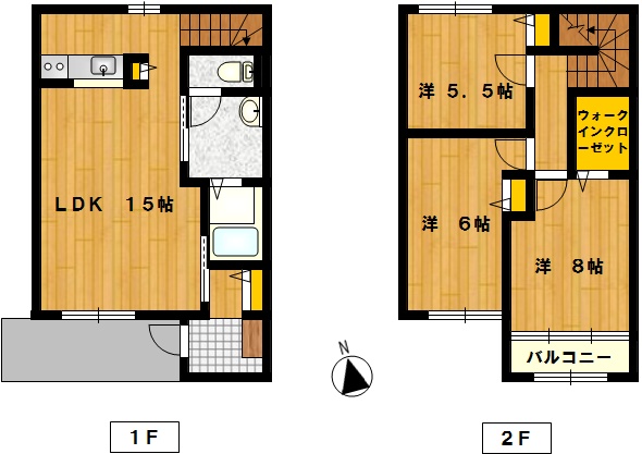 部屋の広さ | 1F:LDK15帖 2F:洋8帖・洋6帖・洋5.5帖 | 対象階数 | 2階建 1.2階 | |