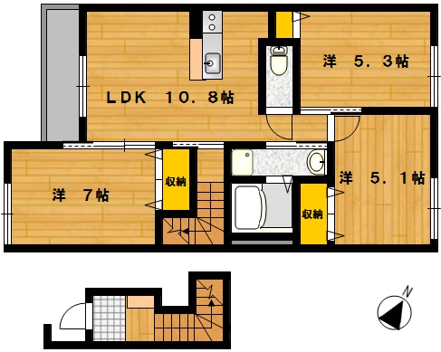 部屋の広さ 洋7帖・洋5.3帖・洋5.1帖・LDK10.8帖 対象階数 2階建 2階