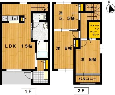 部屋の広さ | 1F:LDK15帖 2F:洋8帖・洋6帖・洋5.5帖 | 対象階数 | 2階建 1.2階 | |