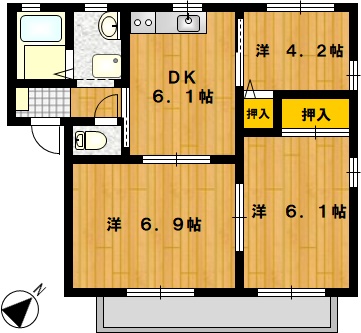 部屋の広さ DK6.1帖・洋6.9帖・洋4.2帖・洋6.1帖 対象階数 2階建 1階